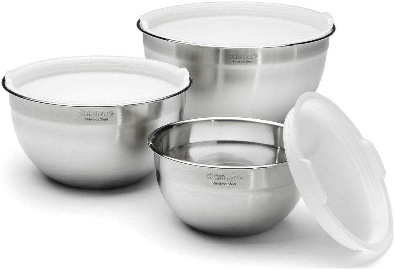 Mix, store, freeze and more with the Cuisinart stainless steel mixing bowl set! These set comes with 1.5, 3 and 5 quart stainless steel mixing bowls, each one with a lid. For storage convenience these bowls nest together making organization easy! Cuisinart made these stainless steel bowls dishwasher and freezer safe and backs them with a lifetime warranty.