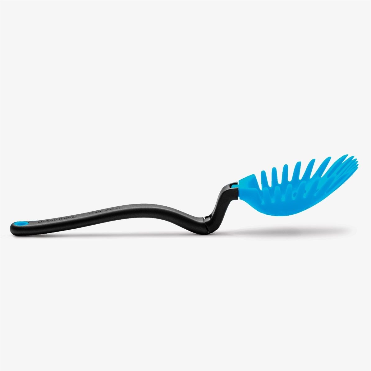 Two heads are better than one, and the Dreamfarm Holey Spadle Slotted Spoon/Ladle in Dreamfarm Blue is no exception! Made in true Dreamfarm fashion, this gadget takes on the jobs of two everyday kitchen tools by easily transforming from a slotted spoon to a straining ladle and pasta server with a simple twist of the joints. The unique multi-use straining head is designed with small holes that make scooping foods like peas and corn easy, and the prongs make it perfect for serving spaghetti and other kinds of pasta. Made from heat-resistant nylon, this tool is also great for shallow frying or draining meat when transferring out of the pan. The handle’s hygienic design removes the need for a spoon rest by raising the spoon head off your counter, which keeps germs off your spoon and food off your counter. Don’t worry about scrubbing saucy residue from this tool while cleaning up from dinner – the Holey Spadle is dishwasher safe, and a half-turn of the joints exposes them for thorough cleaning. Get the best of two of your most reached-for kitchen tools in one with Dreamfarm’s Holey Spadle Slotted Spool/Ladle in Dreamfarm Blue!