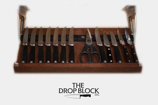 Keep your knives close at hand but out of sight of children’s eyes with Drop Block’s Under Cabinet Knife Storage Rack. This unique under cabinet knife storage strategy allows you to easily display all of your knives when you need them, and put them away and out of reach of small children when you’re done.