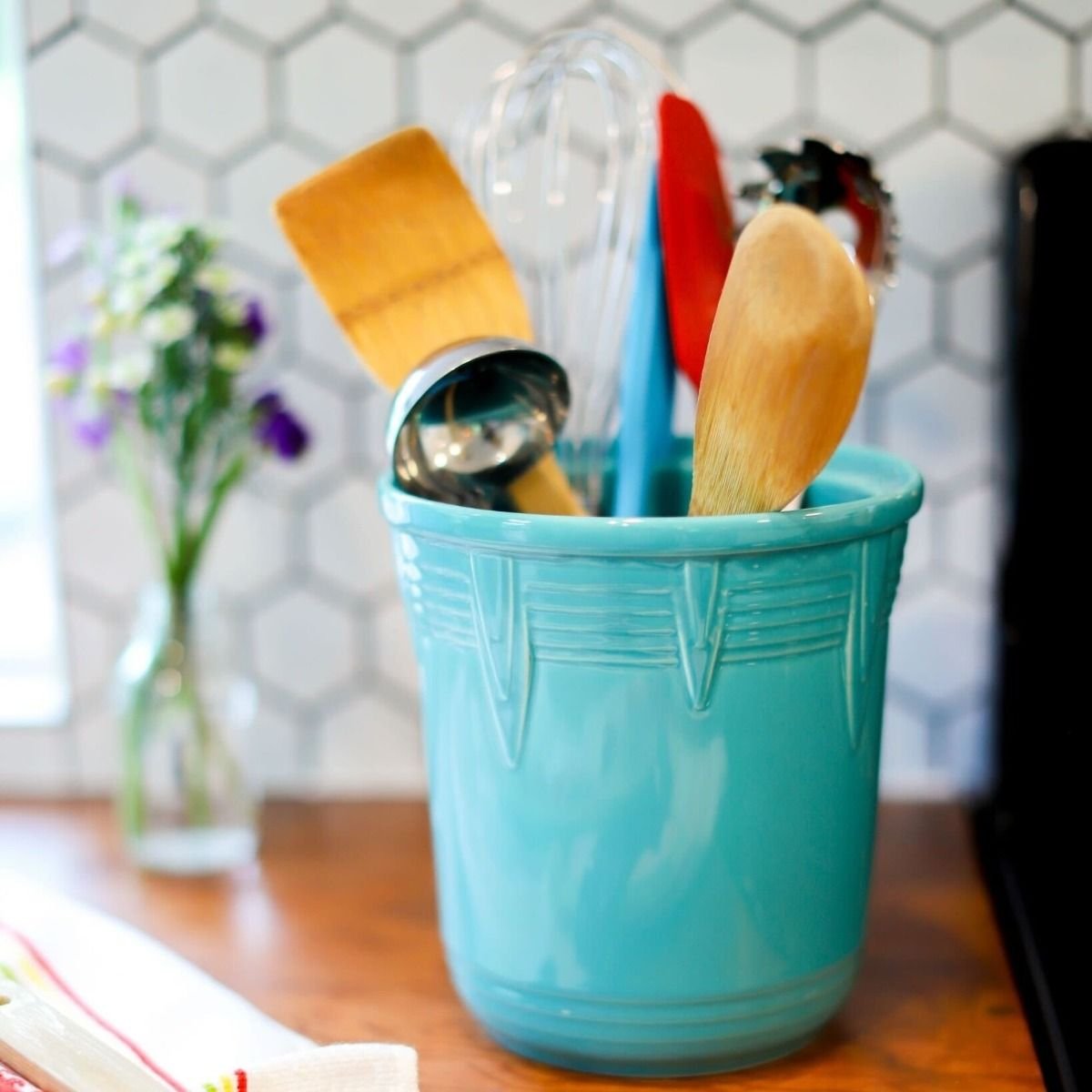 Fiesta® 2 Qt. Chevron Utensil Crock – Turquoise Features: