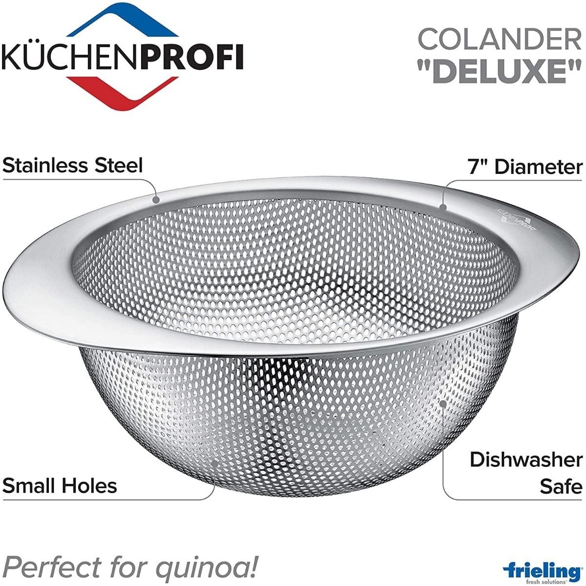 Add the perfect colander for any straining task to your kitchen with the Frieling Deluxe Colander – 7″. This stainless steel colander makes fallen through noodles, rice, and quinoa a thing of the past with its small straining holes that prevent foods from slipping through. With a diameter of 7″, this colander is the perfect size for washing rice before cooking or rinsing produce before storing in your refrigerator. The sleek and durable stainless steel handles allow for a comfortable grip while straining, and the dishwasher-safe design makes cleaning up after cooking or food-prepping a breeze. For a colander that will keep your grains and produce in the bowl and out of your sink, use the Frieling Deluxe Colander – 7″.