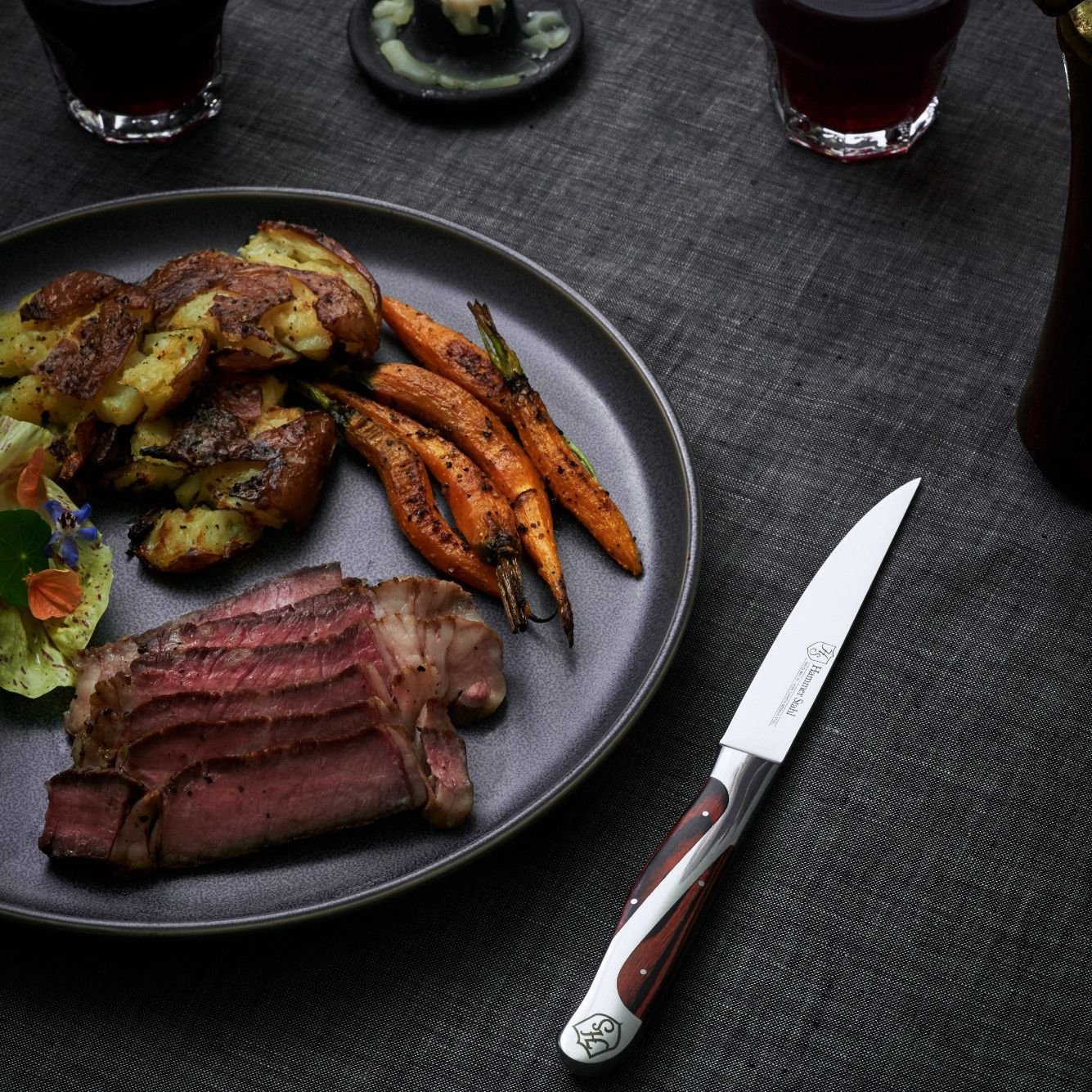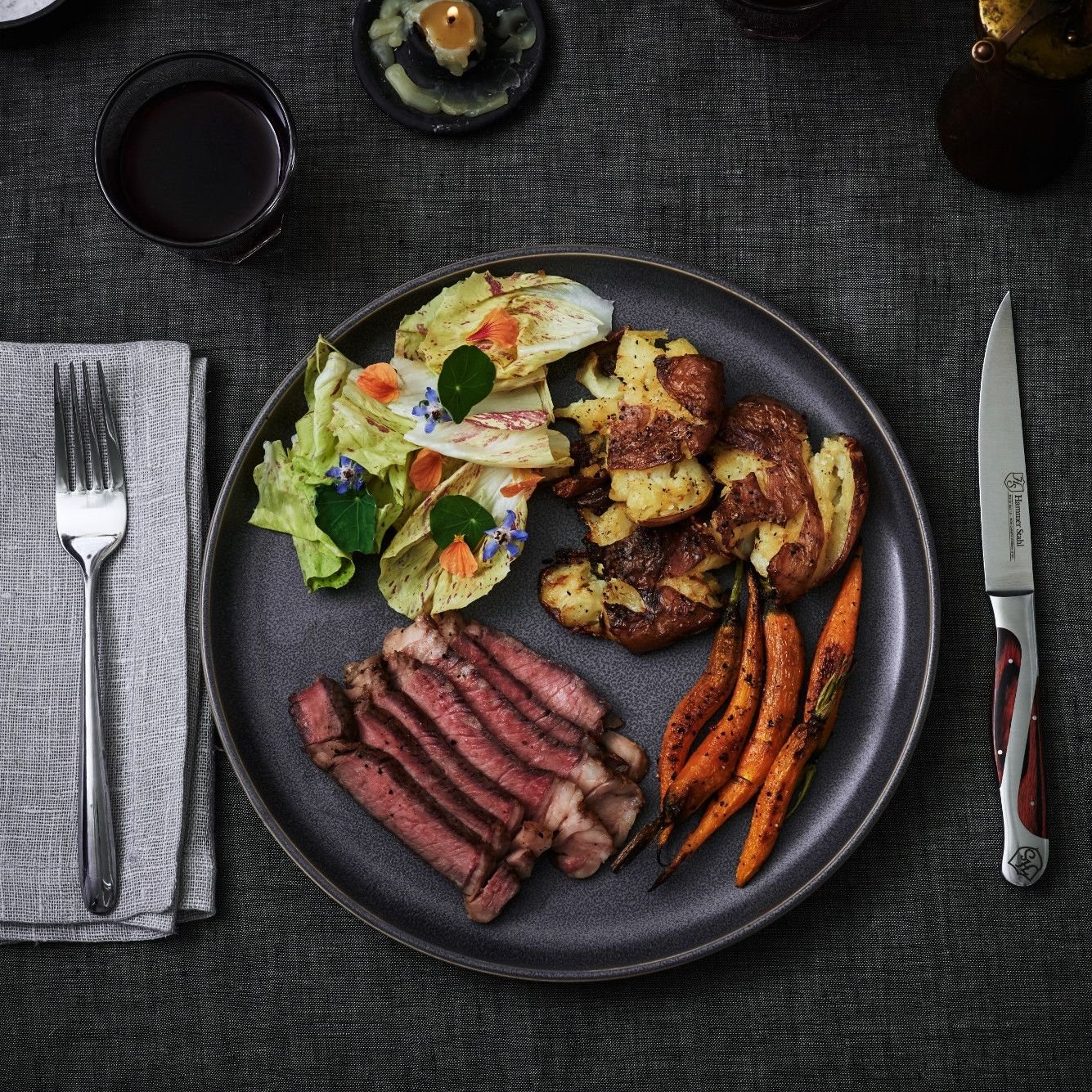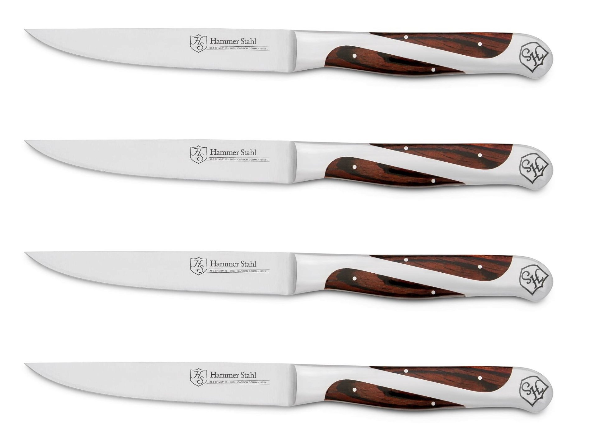 Slice into a delicious steak with ease using the 4-Piece Steak Knife Set from the Hammer Stahl Classic Collection. These beautiful straight-edged knives are sharpened to a 20° bevel for a razor-sharp edge. Just as beautiful as they are effective, each knife features a Pakkawood handle with a quad-tang design that provides better control and ergonomic grip. Arriving in a sturdy gift box with a magnetic closure, this set of 4 steak knives makes the perfect holiday gift or addition to your cutlery collection. Get these German Steel steak knives today and enjoy slicing through your next steak with renewed ease with the Hammer Stahl Classic Collection 4-Piece Steak Knife Set.