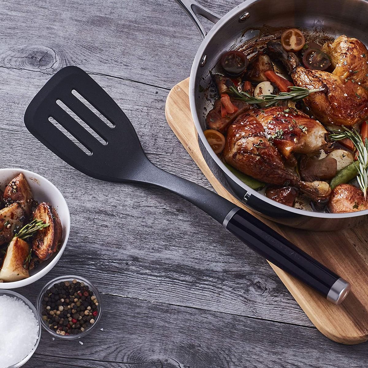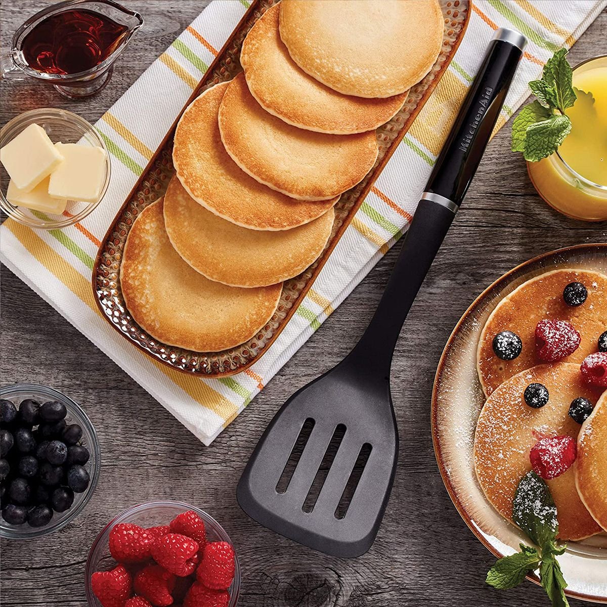 Flip burgers like a pro with the KitchenAid Classic Black Slotted Turner. This turner is made of heat-safe nylon that is safe for use on cookware of all types. The durable construction makes this turner extra durable and features a comfortable handle. The slotted head of this turner gives you the versatility to flip pancakes and drain away excess fat and oil as you cook. Add the KitchenAid Classic Black Slotted Turner to your utensil collection today.