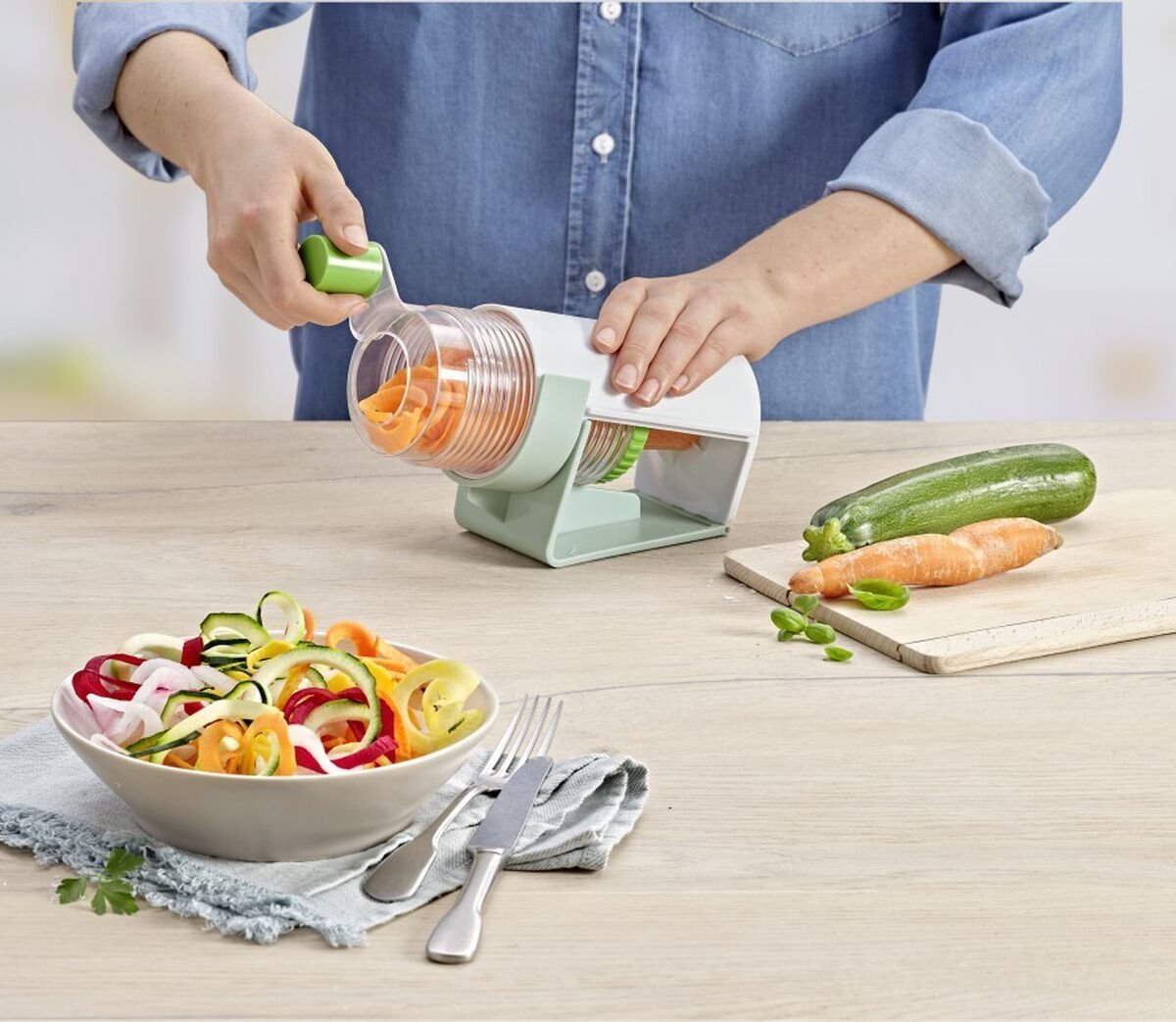If you are craving veggie spaghetti the Betty Bossi Midi Spiralizer from Kuhn Rikon is for you! This unique spiralizer is designed to be compact so it’s perfect for small kitchens while still allowing you to prepare spiralized fruit and vegetables with ease. The unique tightening system of the Midi Spiralizer requires very little force so anyone can use it with ease. This spiralizer comes with two noodle sizes, the classic spaghetti, and the tagliatelle. Despite its size, the Midi Spiralizer is still able to work with fibrous vegetables like potatoes with ease. When it comes to saving space and enjoying delicious vegetables, the Kun Rikon Betty Boss Midi Spiralizer is a must-have for every kitchen, get yours today!