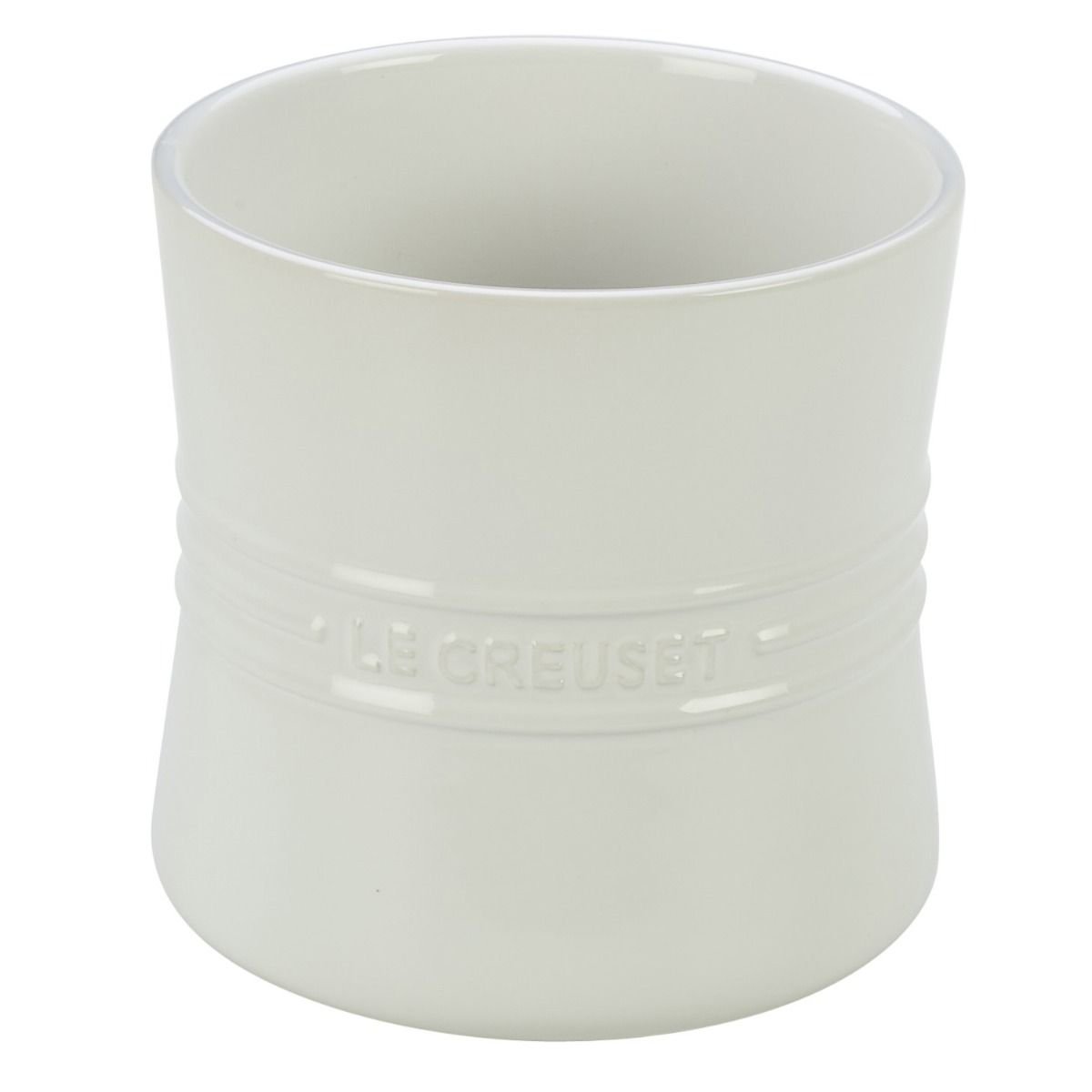 Now you can proudly display all your Le Creuset utensils in the unique 2.5 quart stoneware crock utensil holder. The White colored porcelain enamel finish of this utensil crock is easy to clean and dishwasher safe. The handcrafted design of Le Creuset stoneware with the 3 ring accents highlights the glossy enameled finish and makes each one of these utensil crocks a one of a kind display piece. So keep you kitchen tidy in style with this White Le Creuset stoneware utensil cock.