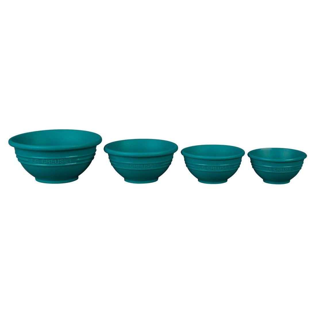 Measure ingredients, serve up condiments and sauces, and so much more with the Le Creuset Caribbean Blue Prep Bowl Set. This 4-piece set has flexible silicone bowls in 1/4-cup, 1/3-cup, 1/2-cup, and 1-cup sizes. They’re safe for the microwave and freezer and are heat resistant up to 482°F. The Caribbean Blue color of this set matches well with other enameled Caribbean Blue products in the LeCreuset line. Use these small bowls to stage chopped herbs, to measure and melt chocolate for a recipe, to offer sauces and dips along a buffet line, and more!