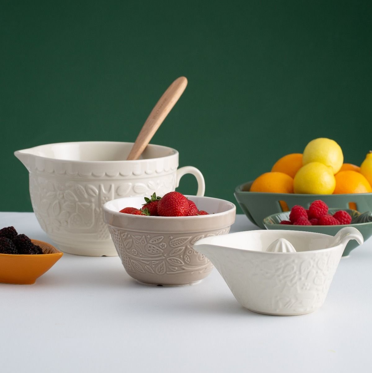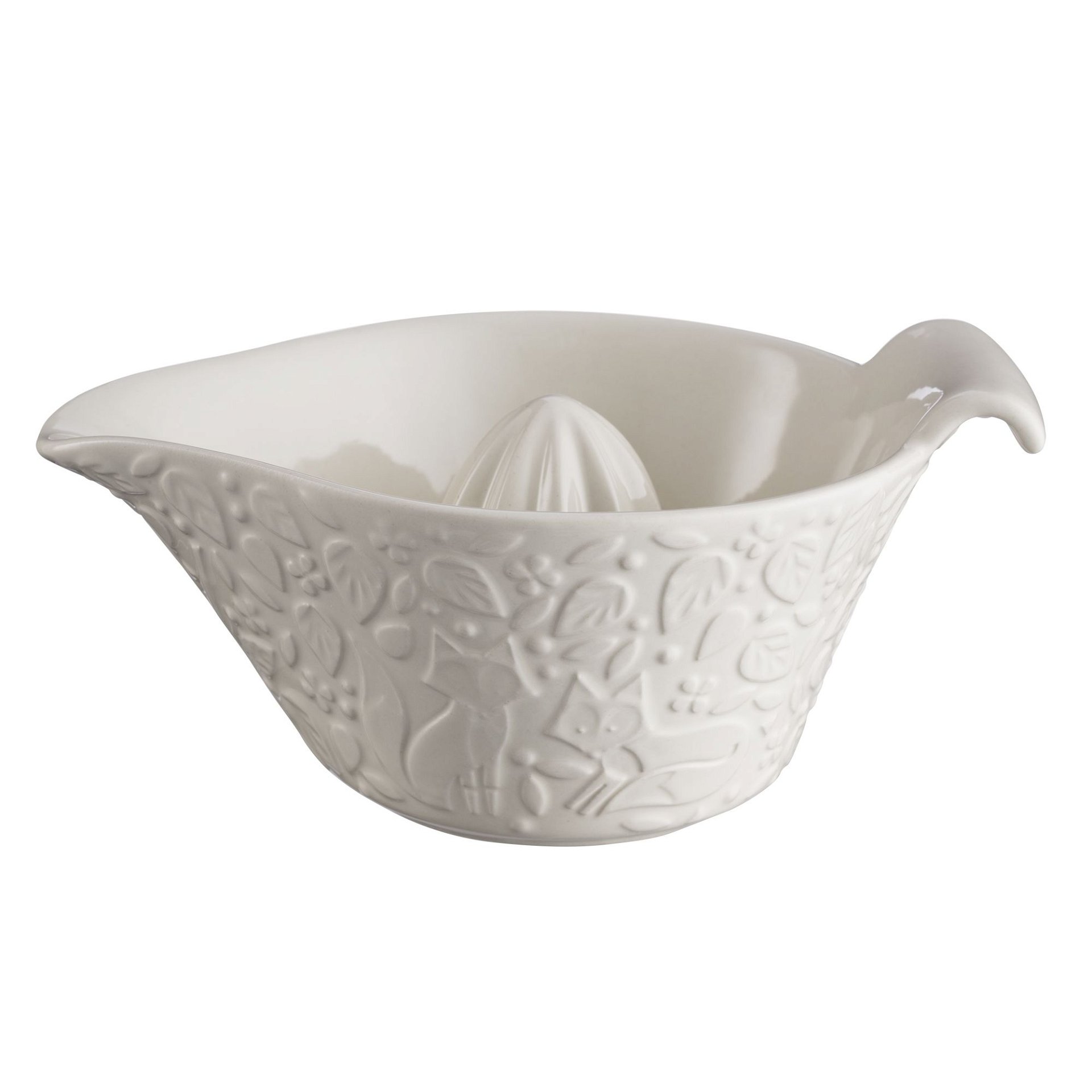 Nature’s sweet supply! When everyday tasks have you going around on empty, it’s important to just take it easy with a big glass of freshly squeezed orange juice collected inside the Cream In the Forest Juicer by Mason Cash. A jar is good but a juicer is better, and with a convenient handle in the back and lip in the front to make the process even easier. Depicted on the exterior, an embossed tranquil forest scene inspired by imaginative folk tales blossoms vibrantly all around for you to see and feel. Of durable stoneware, the honey pot resists scratches and chips that may occur from constant use. So, enjoy the all-natural flavor of fruit juice poured directly from the Mason Cash In the Forest Juicer.