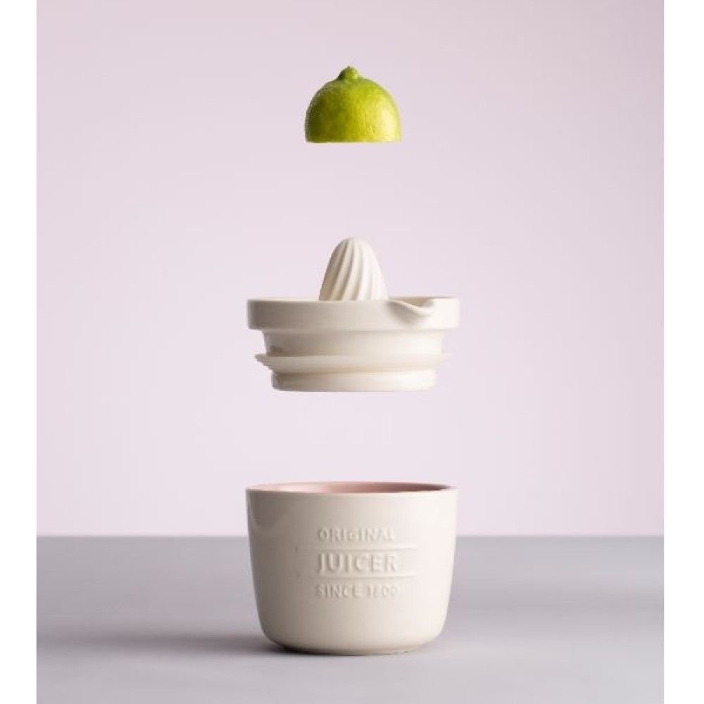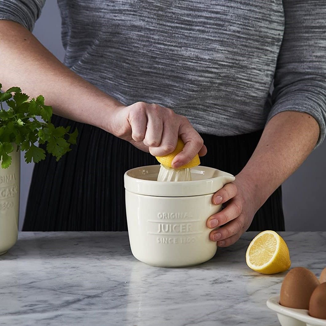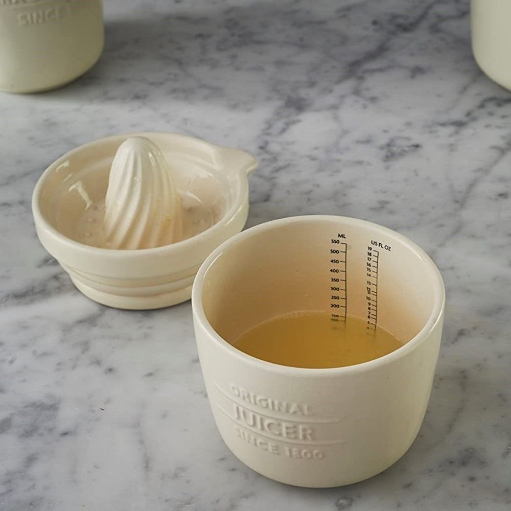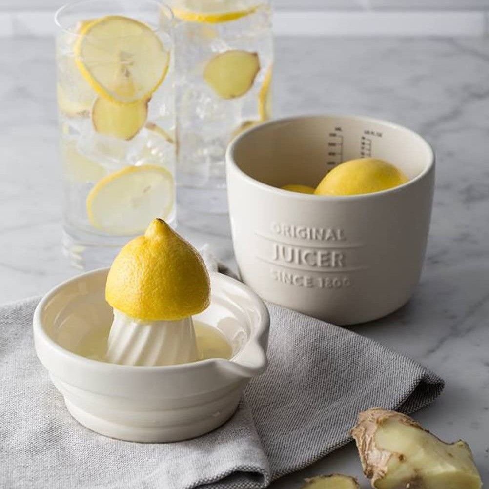 Juice lemon for a vinaigrette and store the leftover lemon half, or the remaining juice in the Innovative Kitchen Juice & Store by Mason Cash! Crafted from carefully-selected stoneware, this smart, double-duty juicer is durable and will stand up to frequent use. The 2-piece Juice & Store has a citrus reamer that’s designed to catch pips as you juice. After juicing, use the spout to pour the liquid into the base for measuring or storing. Got leftover juice or an unused lime half? Store it right in the base! When in place, the top reamer creates an airtight seal for freshness. Use this smartly-designed juicer to extract all the juice from a grapefruit for breakfast or to juice citrus fruit for a recipe!