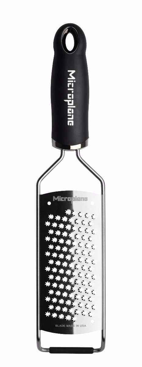 Are you looking for the perfect tool for grating hard cheese, chocolate, and ginger into soft fluffy mounds that melt instantly into sauces without needing any “elbow grease” to get the job done? Microplane’s Gourmet Series Star Grater is the one you’re looking for! The original company to bring the woodworking tool out of the garage and into the kitchen, Microplane’s ultra-sharp blades are photo-etched instead of stamped like most of the competition, so while other graters you’ve used may have seemed dull, a Microplane blade will never disappoint. The graters in the Gourmet Series are paddle graters, used by chefs and gourmands everywhere. A non-slip base keeps the grater safely in place, while a soft-touch handle makes it comfortable to use. Able to grate any food easily, you’ll be reaching for this star grater time and again to grate fluffy piles of Romano cheese onto your pasta, superfine garlic and ginger for stir fry, for tiny bits of zest from citrus for delicate desserts, and more!