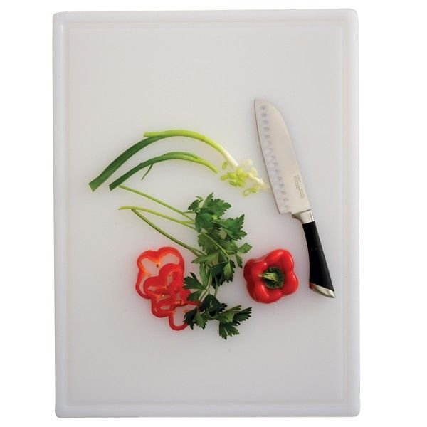 Prep any ingredient with this Professional Poly Cutting Board by Norpro! This large cutting board, sized 24” x 17”, leaves plenty of room for tackling large ingredients, or chopping and staging on the cutting board. Made of Polyethylene and approved for commercial and industrial use, this board is grooved on one side to catch juices and smooth on the other side. A convenient handle makes it easy to carry or to hang for storing. Reach for this board to prep produce, use it grooved side up to carve meat, or designate it to be used for handling raw poultry.