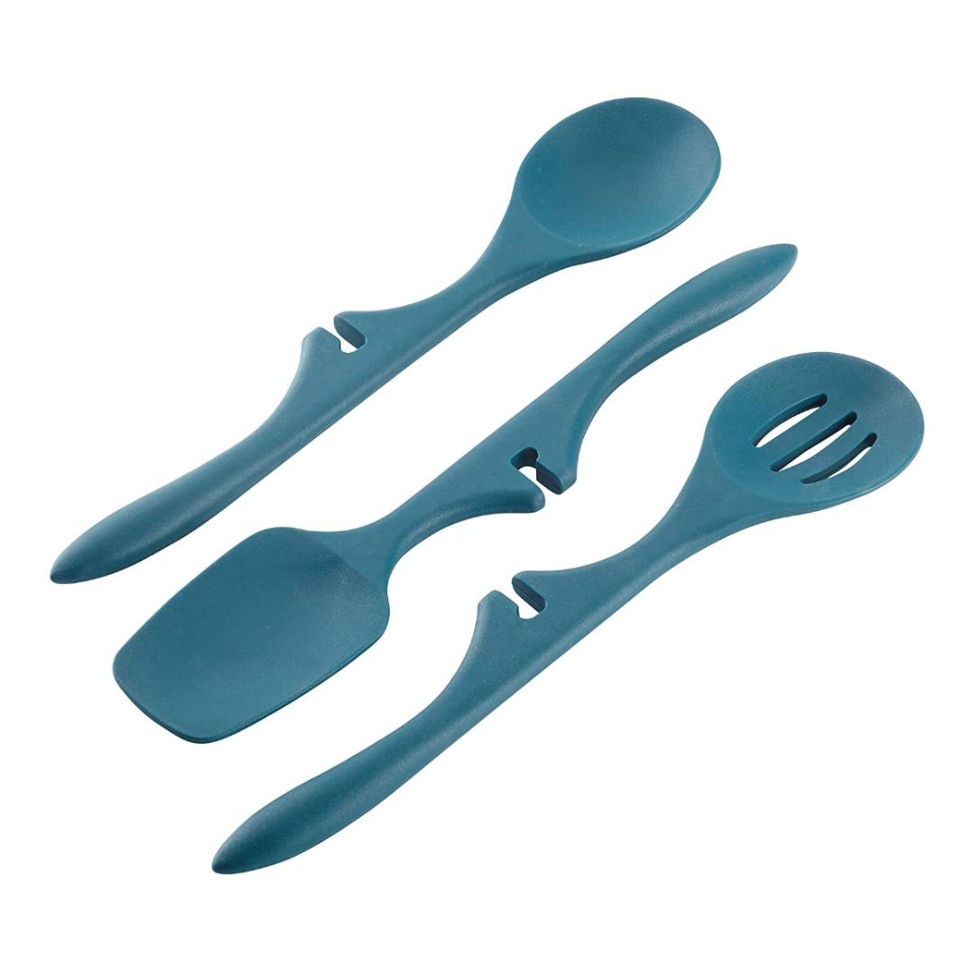 If you’re looking to make stylish additions to your kitchen, the Rachael Ray 3-Piece Lazy Tools Set in Marine Blue is what you’ll need. The set includes a Lazy Spoon, Slotted Spoon, and Spoonula: all made from durable silicone that can handle the heat on the range. Each piece is designed with a groove at the handle to set neatly on the rims of pots and pans that help keep countertops, stoves, and tables mess-free!