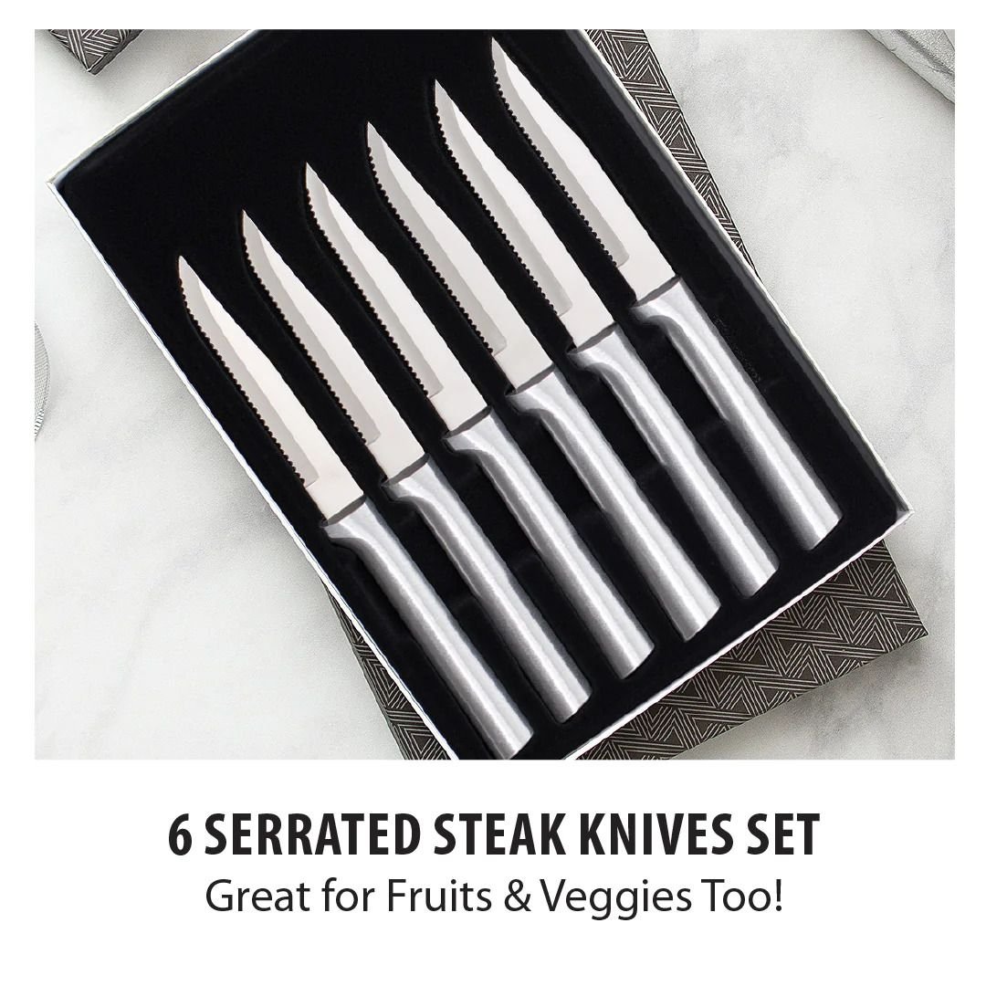 Complete your kitchen knife collection with the 6-Piece Serrated Steak Knife Set from Rada Cutlery. With blades constructed from surgical quality high carbon stainless steel and sleek silver satin handles, this set is as aesthetically pleasing as it is practical. The hand-sharpened, hollow ground blades are designed to maintain a razor sharp edge for easily cutting through even the toughest foods. Whether you’re in search of new knives for your own home or the perfect housewarming or wedding gift, the Rada Cutlery Serrated Steak Knife Set is the perfect choice!
