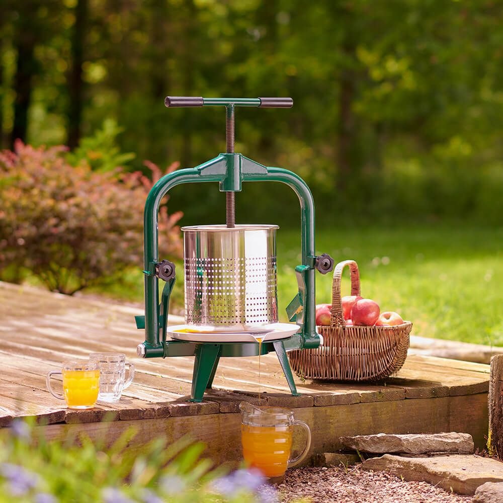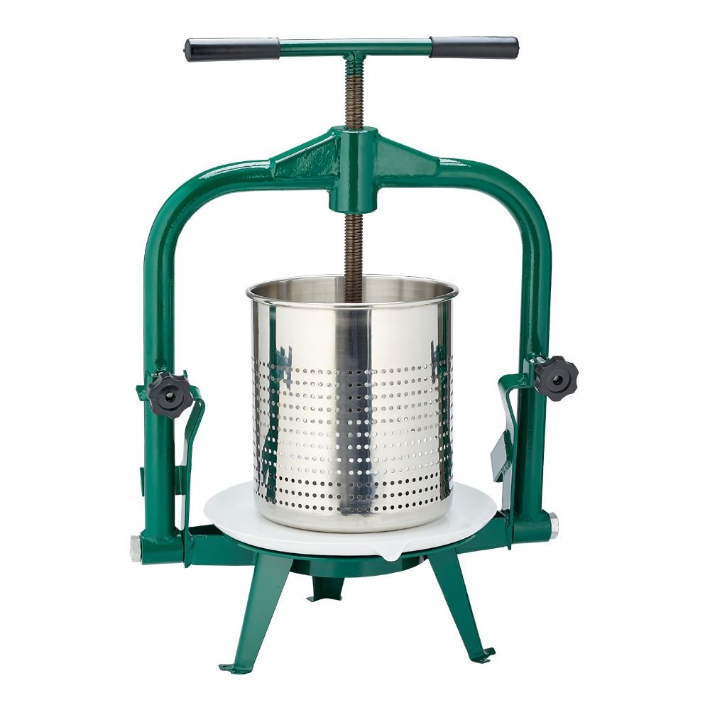 Press grapes, apples, citrus fruits, and more to make your own homemade juices or wines using the Roots & Harvest Stainless Steel Fruit & Wine Press! This steel wine press makes easy work of juicing your favorite fruits with the thread type pressing device that allows you to screw the press into the fruits for thorough extracting. The food-grade stainless steel basket can hold up to 30 pounds of uncrushed fruits, and the fine mesh holes allow the juice to flow through without the need for a filter bag. To allow for a controlled pour of juices when extracting, the pressed steel basin features a spout – preventing the need for heavy lifting. When your fruits have been fully juiced, the tiltable frame makes removing pulp and adding more fruits simple. Whether you plan on turning your freshly pressed juices into homemade sangrias, lemonades, or smoothies, the Roots & Harvest Stainless Steel Fruit & Wine Press makes it an easy task!