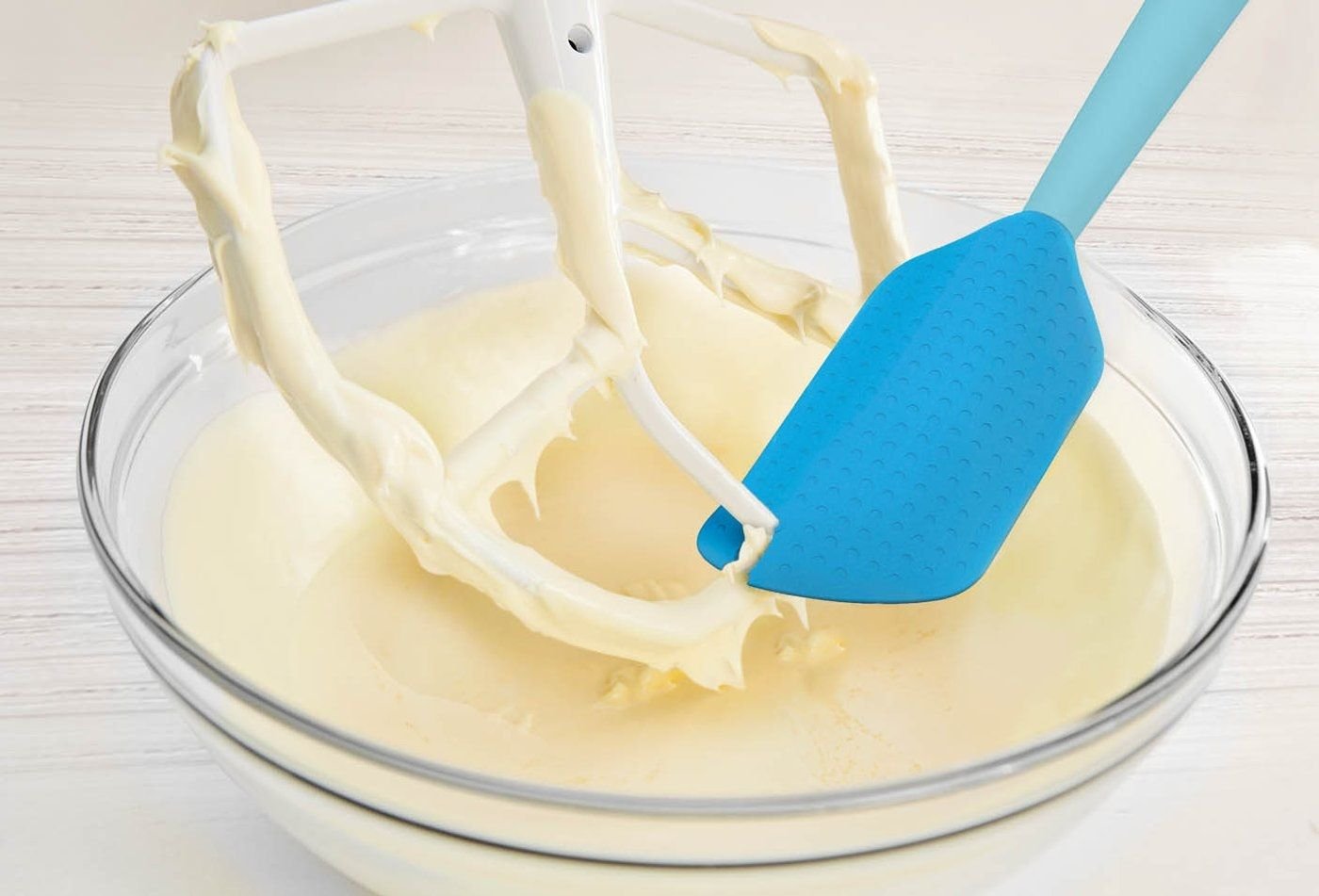 - Angled blade – scrape curves and corners of bowls or pans