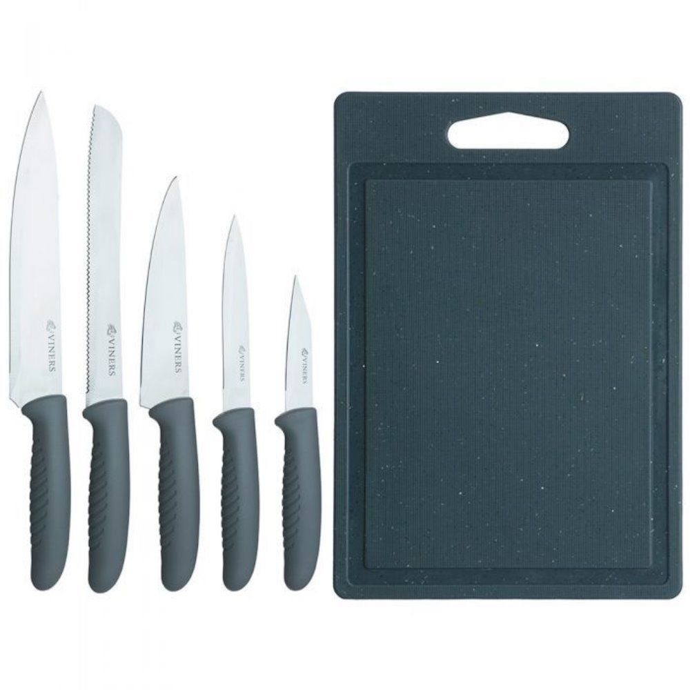 Are you looking for quality knives that won’t break the bank? Go with the Viners 5-Piece Knife Set with a speckle chopping board. This basic knife set is a great way to start your knife collection and be able to instantly tackle any kitchen task. The set includes an 8″ Chef’s Knife, 8″ Bread Knife, 6″ Small Chef’s Knife, 5″ Utility Knife, 3.5″ Paring Knife, and speckle chopping board.