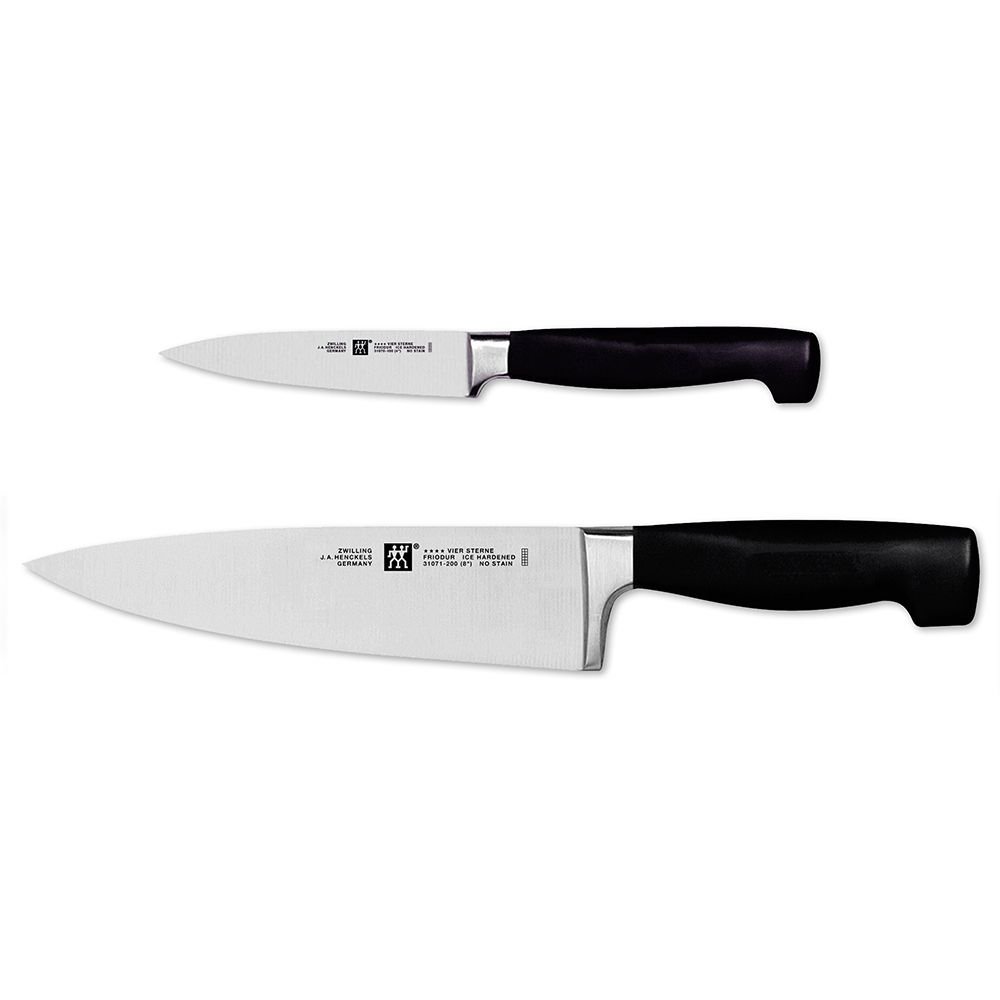 The Zwilling J.A. Henckels Four Star knives are known for maintaining the same nostalgic, yet effective design of 1976. The Zwilling special formula Friodur steel blade is ice-hardened, hand sharpened, and polished by hand. The three rivet handle is designed with a full tang, ensuring a lifetime investment that will prepare the family recipe for generations to come. Chop fresh vegetables, slice savory meat, and peel potatoes to make delicious stew, stir fry, or other delicious dishes with your new Zwilling J.A. Henkels Four Star 2pc “Must Haves” Knife Set.